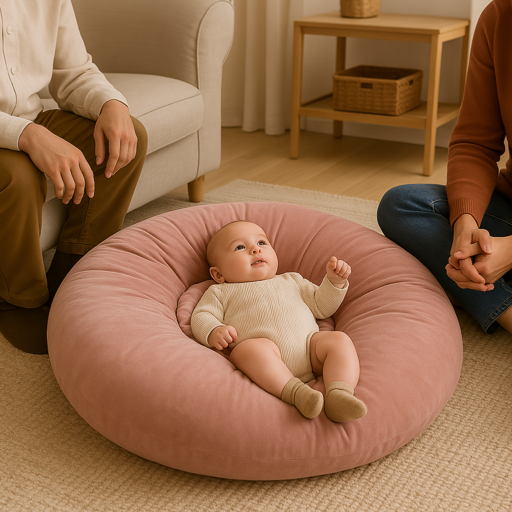 Le Coussin nid permet de libérer les mouvements de l’enfant. Cette position du corps, bien en appui sur le coussin, favorise la prise de conscience du schéma corporel.